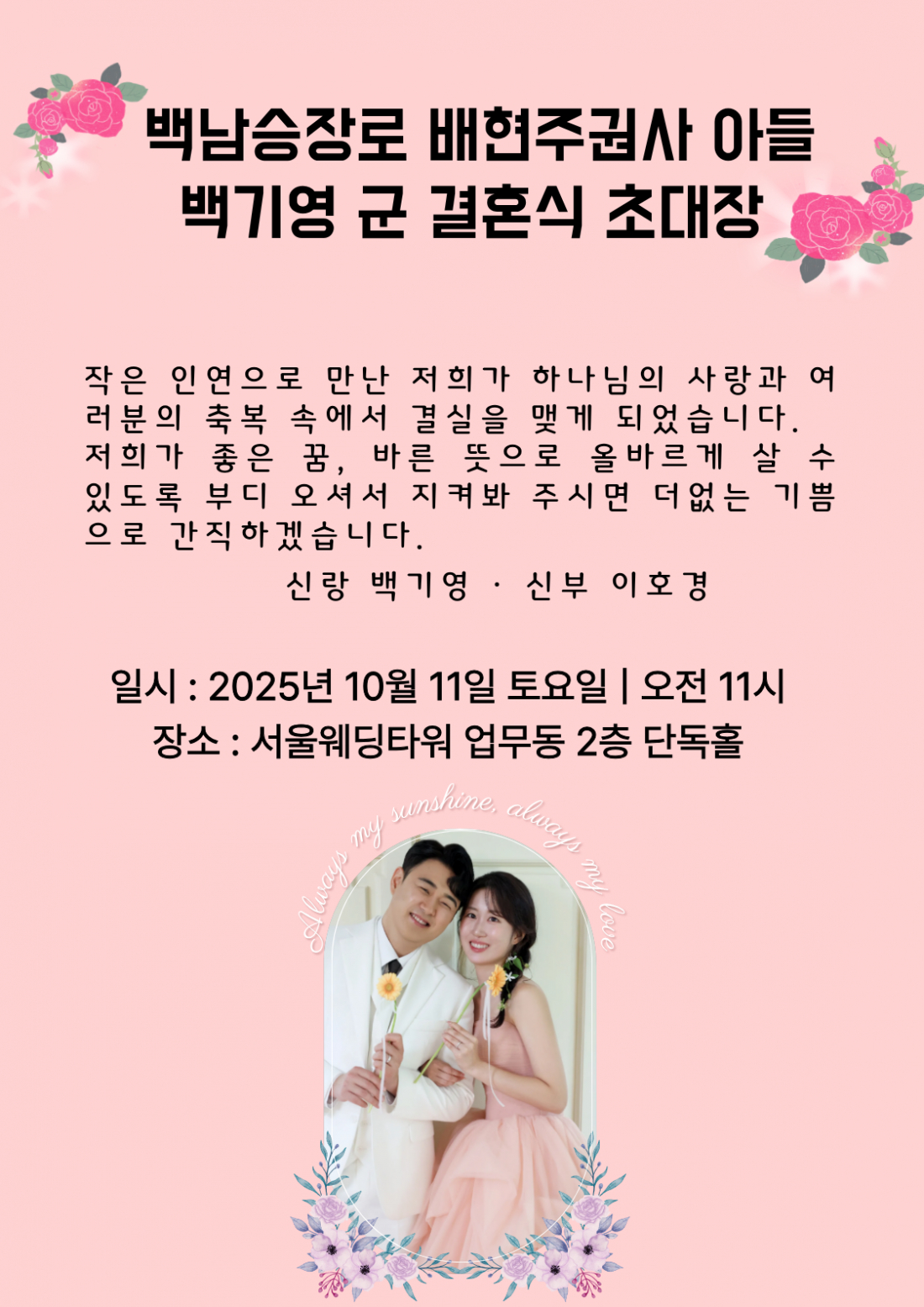 [결혼] 백기영(백남승 장로, 배현주 권사 아들) 이호경 초청장 25.10.11(토)