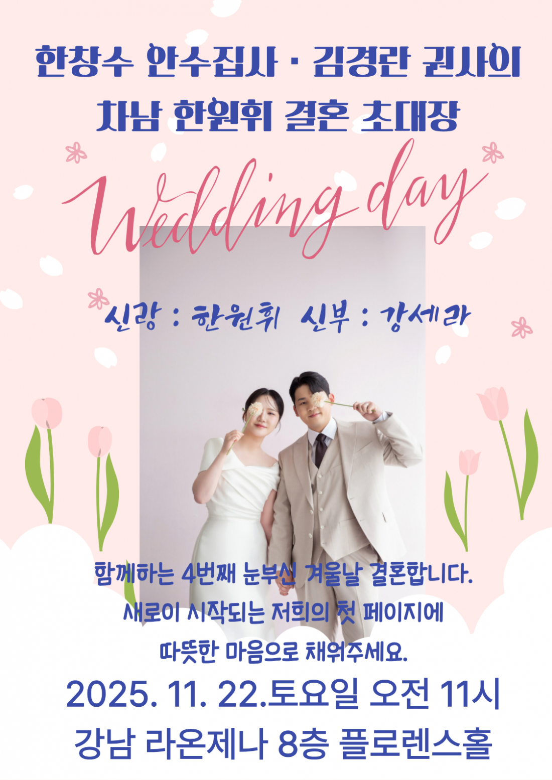 [결혼] 한원휘군 (한창수 안수집사, 김경란 권사 차남) 2025.11.22.(토) 오전11시