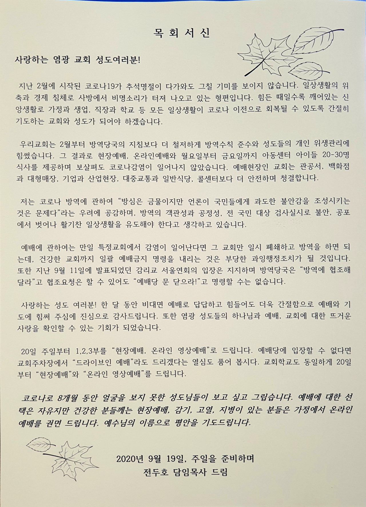 20.09.19 담임목사님 목회서신